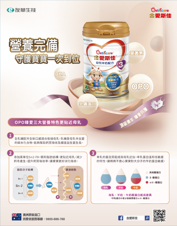 友華旗下金愛斯佳品牌與澳洲Anma乳品大廠經過2年研發,針對台灣寶寶營養需求提供更優質的羊奶配方,以『銜接母乳』為概念核心,推出澳洲原罐進口的金愛斯佳OPO臻愛幼羊配方,擁有三大特色, 讓寶寶成功銜接母乳