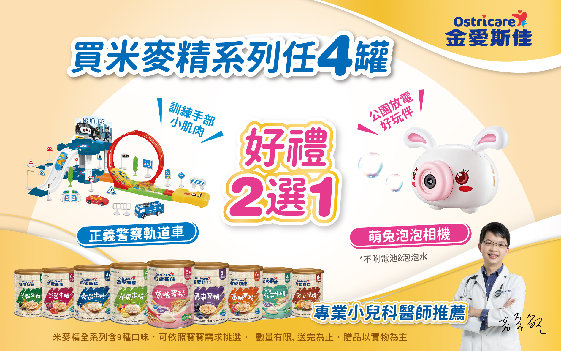 即日起購買米麥精系列任4罐,就有機會獲得金愛好禮「正義警察軌道車 或 萌兔泡泡相機」!