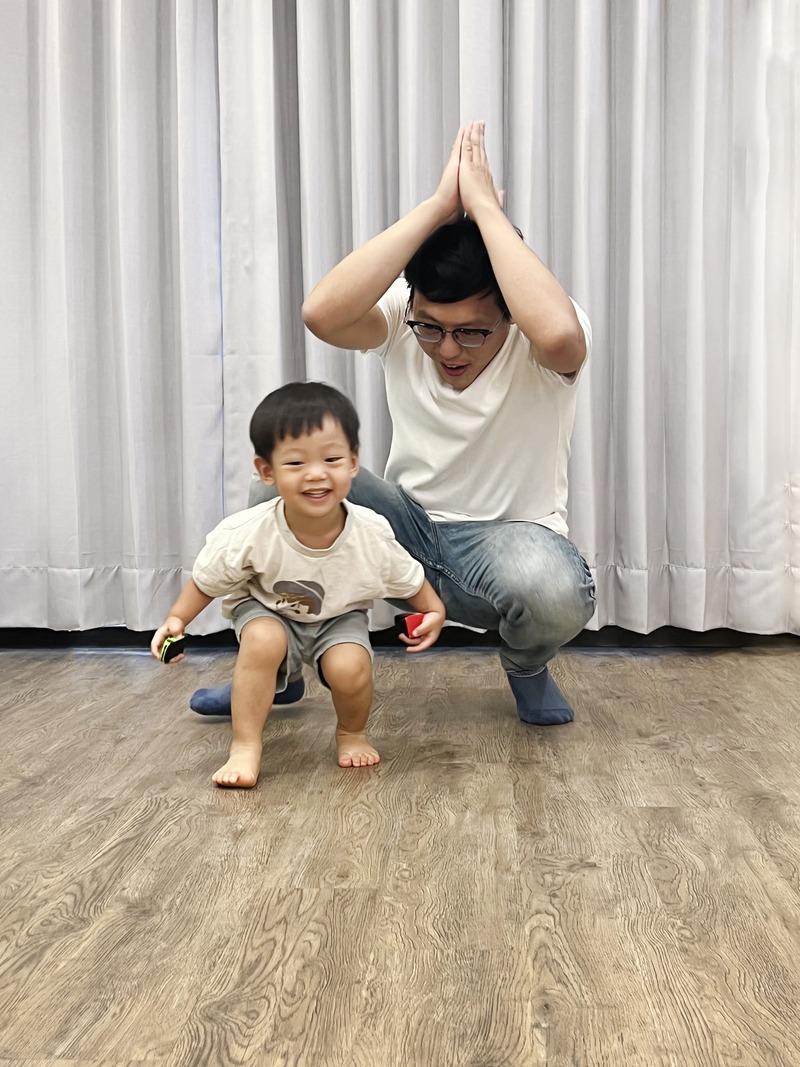 (先讓小孩抓住大人大拇指,大人以另外四指包覆孩子的手並協助穩定腕關節,孩子用雙腳沿著大人的小腿、膝蓋、大腿、肚子往上攀爬,過程中可視情況給予往上的力量。)