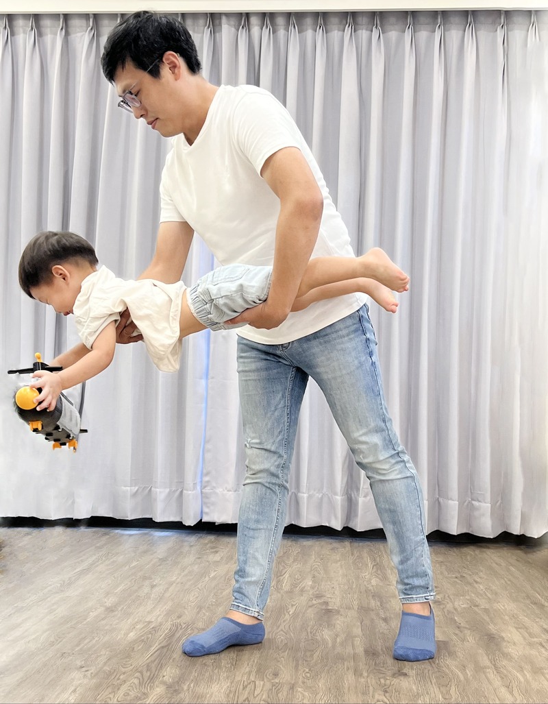 (扶著小孩大腿與胸口,小孩腳伸直、手往前伸,並鼓勵小孩將頭抬起)