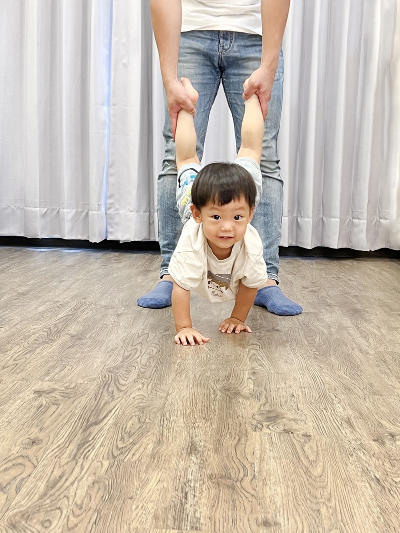 (扶著小孩大腿與胸口,小孩腳伸直、手往前伸,並鼓勵小孩將頭抬起)