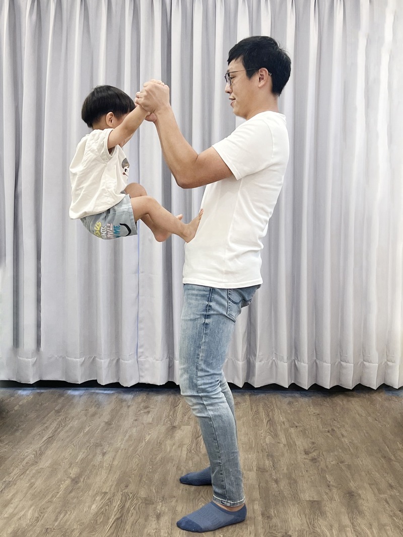 (先讓小孩抓住大人大拇指,大人以另外四指包覆孩子的手並協助穩定腕關節,孩子用雙腳沿著大人的小腿、膝蓋、大腿、肚子往上攀爬,過程中可視情況給予往上的力量。)