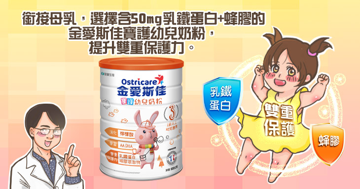 有些營養素不易從日常食物取得,如葉酸和乳鐵蛋白,可用營養品補充。而乳鐵蛋白是打底寶寶保護力的重要營養素,黃彥銘院長說明,乳鐵蛋白是一種存在乳汁中的蛋白質,會與鐵結合搶走保護力敵軍的食物,造成敵軍因缺鐵而減損。母乳的乳鐵蛋白含量很高,是很好的來源,停止哺餵母乳時,則可選擇含乳鐵蛋白的配方奶做銜接。選購時要特別注意添加量,金愛斯佳寶護幼兒奶粉,乳鐵蛋白含量高達為50mg/100g,已達相關研究添加劑量,並添加可增加保護力活性的蜂膠,雙重強化寶寶內在保護力。